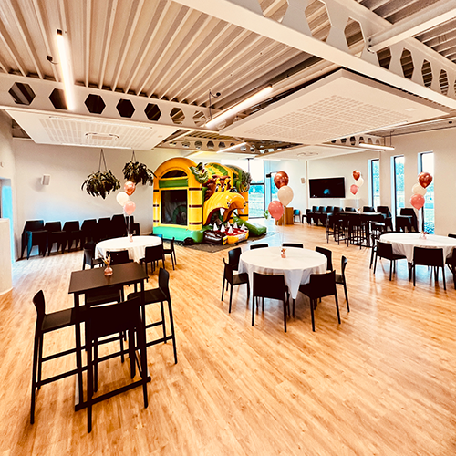 - De grote zaal is 200 m² en staat standaard opgesteld voor het geven van lezingen, met een spreekgestoelte vooraan. Er hangen 2 grote beeldschermen waarop u bijvoorbeeld een film kan afspelen. Er is de mogelijkheid tot livestreaming. Uiteraard kan de zaal ook anders geschikt worden, bijvoorbeeld met tafels en stoelen, een springkasteel, ... In de standaardopstelling biedt de zaal zitplaats tot 200 personen.