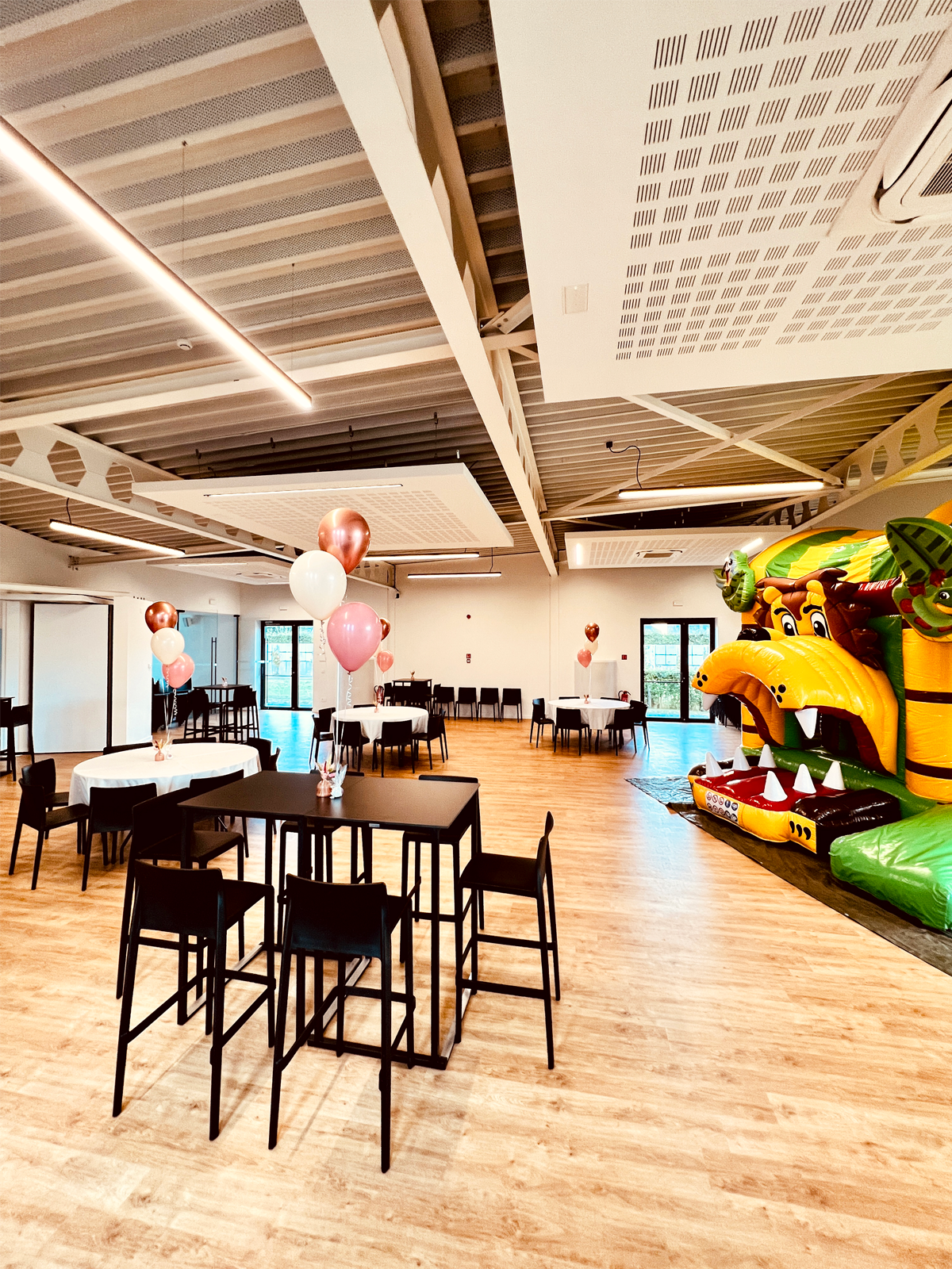 kleine zaal is 68 m². Deze zaal biedt voldoende ruimte voor babyborrels, verjaardagsfeesten, etc. De zaal is naast de keuken gelegen. Er hangt een beeldscherm waarop u foto’s of iets anders kan afspelen, er is ook een beamer voorhanden. Er zijn zowel ronde als rechthoekige tafels: 8 grote ronde tafels (8 personen), 4 kleine ronde tafels (6 personen) en 20 rechthoekige tafels (4 personen). Daarnaast zijn er nog 10 receptietafels met barkrukken. Naargelang de activiteit kunnen de tafels naar wens opgesteld worden. Tafellakens, servies, bestek en glazen zijn beschikbaar en in de huurprijs inbegrepen. Er staat ook een klein koelkastje met dranken voor kleinere evenementen. Deze kleine zaal heeft directe toegang tot het terras en park. Bij mooi weer kan hier uiteraard ook gebruik van gemaakt worden. De kleine zaal biedt zitplaats aan tafel tot 70 personen.